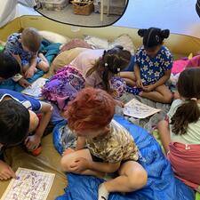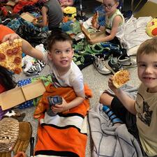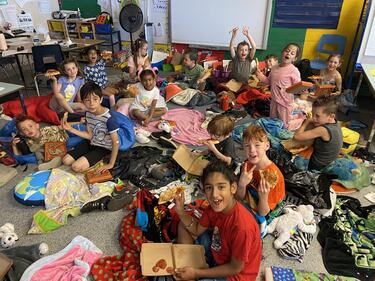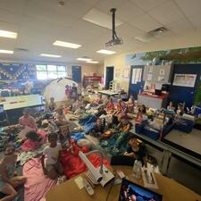 Mrs. Adi's Kindergarten and Grade 1 class along with their buddies in Mrs. Hall's Grade 2 class enjoyed a "Camping Day" together. Activities included a scavenger hunt, camping games, songs, flashlight reading, a camping pizza party, movie in the dark... and of course S'MORES!
