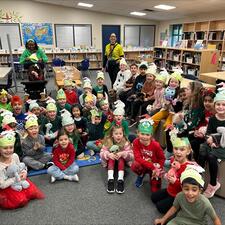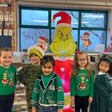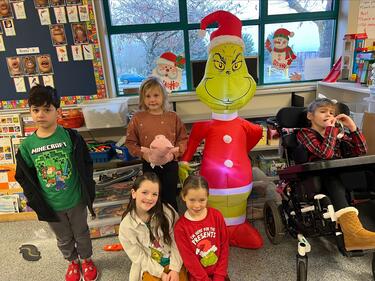 Students with blow up Grinch Breadcrumb Home News Stories news Grinch Day! December 8, 2023 Mrs. Adi's Kindergarten class along with their buddies in Mrs. A Hall's grade 2 class were breaking in the holiday season with "Grinch Day"!