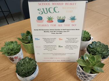 This week Sandy Hill staff were treated to a week long appreciation from the PAC. Monday was succulents, followed by a taco bar for lunch on Tuesday, a candy bar on Wednesday, coffee, tea, and cakes on Thursday and to end the week off a pull string gift card game! We certainly felt the love and appreciation.